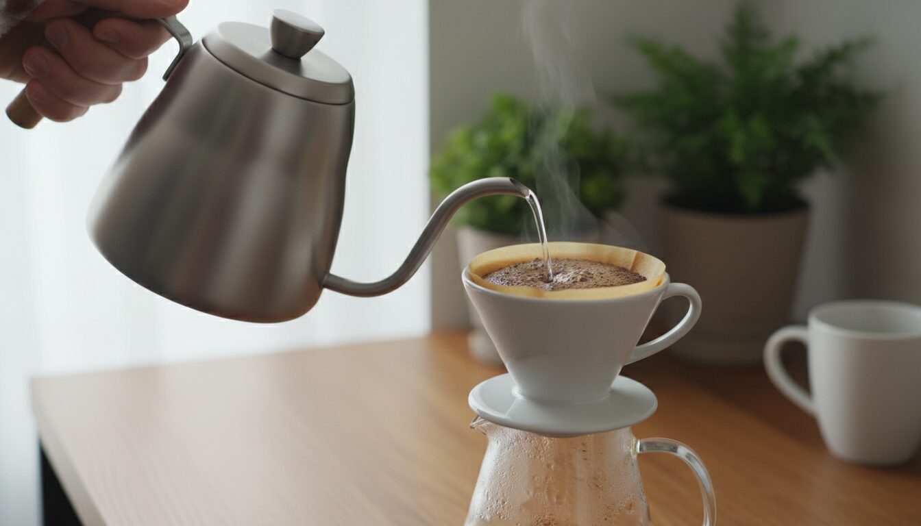 一般的なやかんや普通の電気ケトルと比べると、雑味が抑えられ、コクや香りが際立つように感じます。粉全体にお湯を薄く何度も行き渡らせやすいため、最初の蒸らし(ブルーミング)がしっかりとれ、スッと抜けるクリアな後味になりやすい印象です。