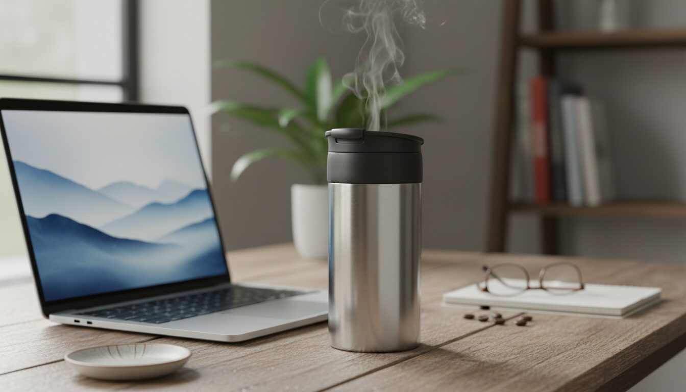 フタ付きモデルを中心に、丸一日デスクワークで使ってみました。真空二重構造のおかげで「放置しても熱い」が現実になります。